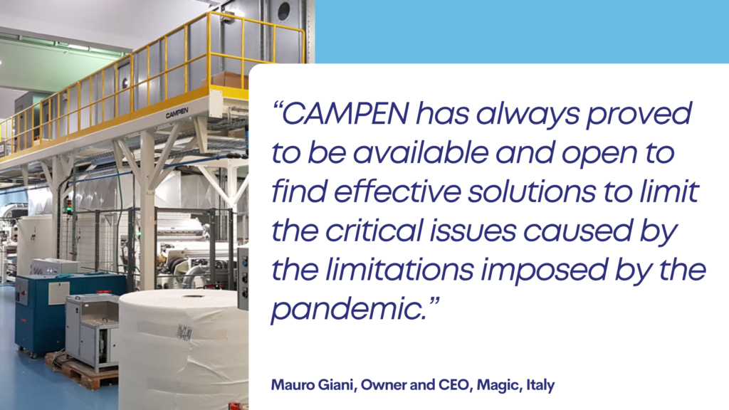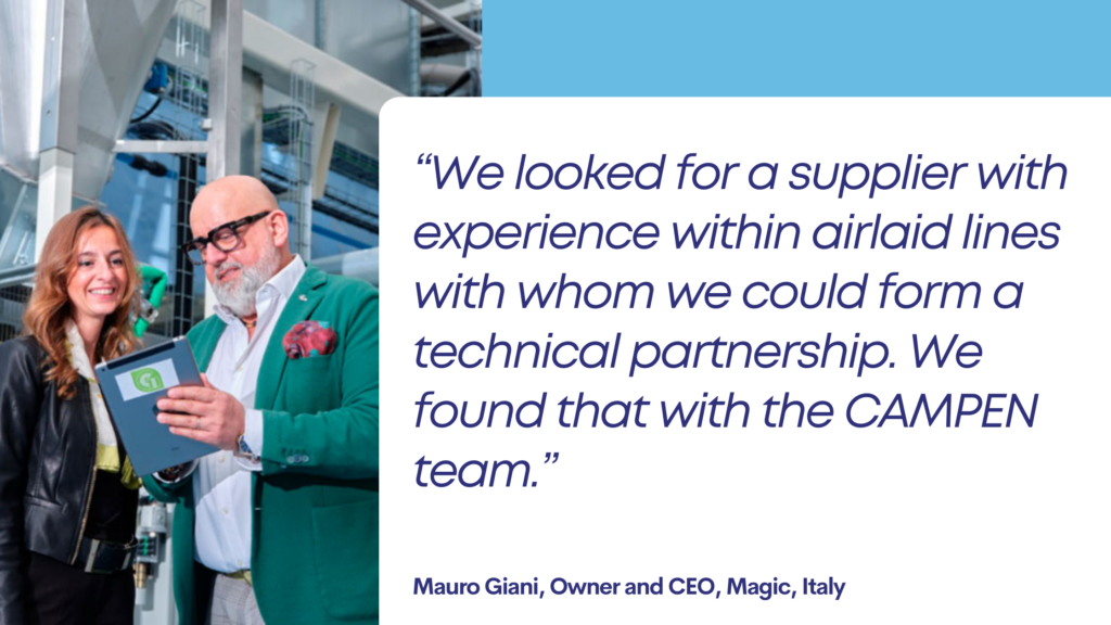 When Magic had decided upon purchasing their own airlaid line, they contacted an airlaid technology expert in Italy, who, based on experience, recommended hiring CAMPEN. The expert assessed that CAMPEN had great airlaid machinery knowledge and the right competence and experience with combining sustainable product development and high-quality machinery. Mauro Giani says: “We looked for a supplier with experience within airlaid lines with whom we could form a technical partnership. We found that with the CAMPEN team.”
