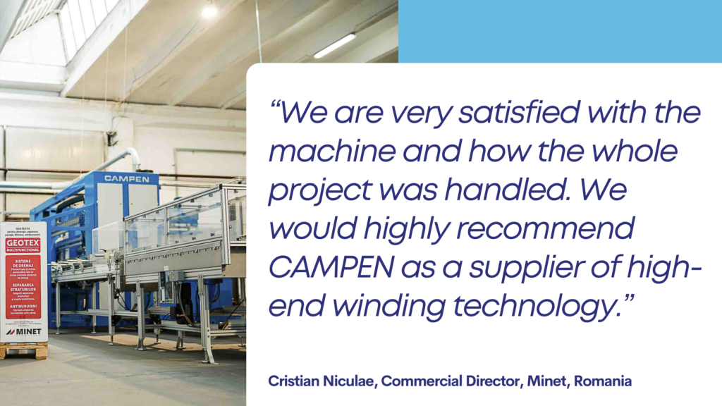 During recent years, Minet has invested massively into new, modern production facilities and technology. Cristian Niculae explains: “In our opinion, a competitive market, the continuous investments and optimizations represent a guarantee of quality products and services. The dynamics of the Minet development has led to radically technological changes because we constantly and consistently invest in the state-of-the-art technology, and the choice of CAMPEN as a supplier for the slitter / rewinder has been no exception here.”